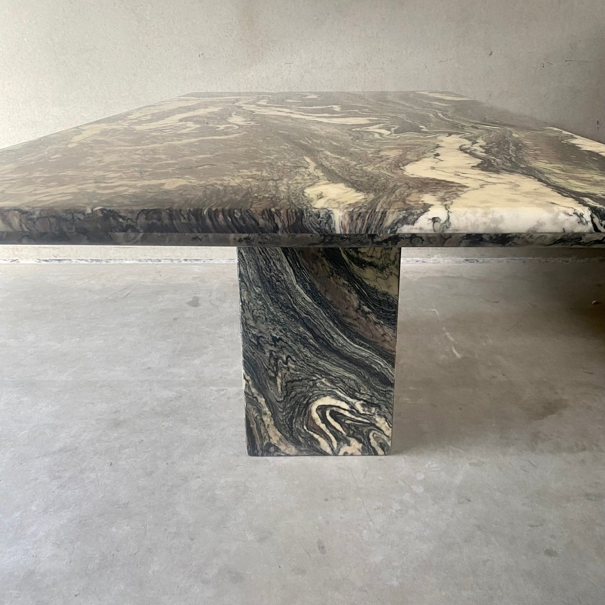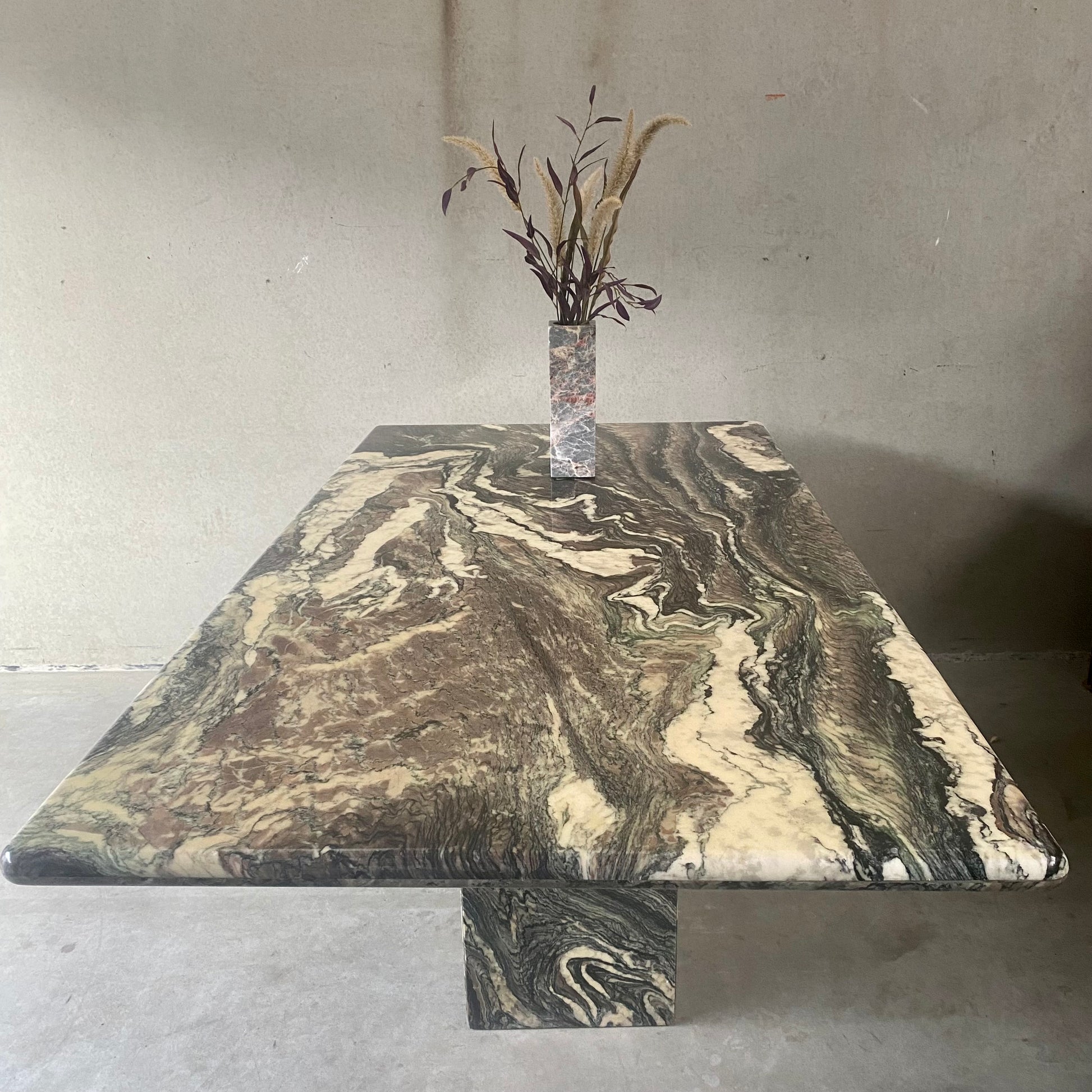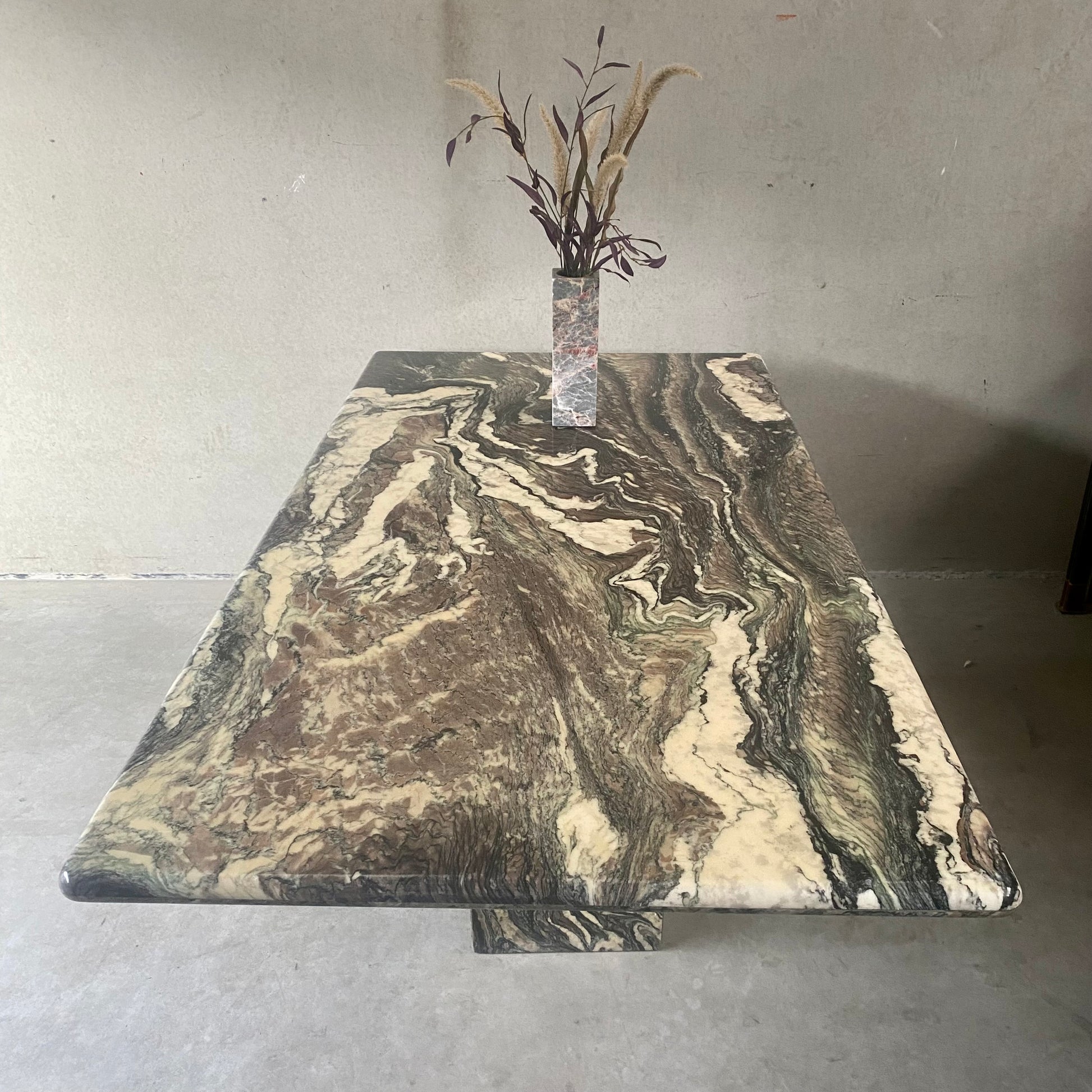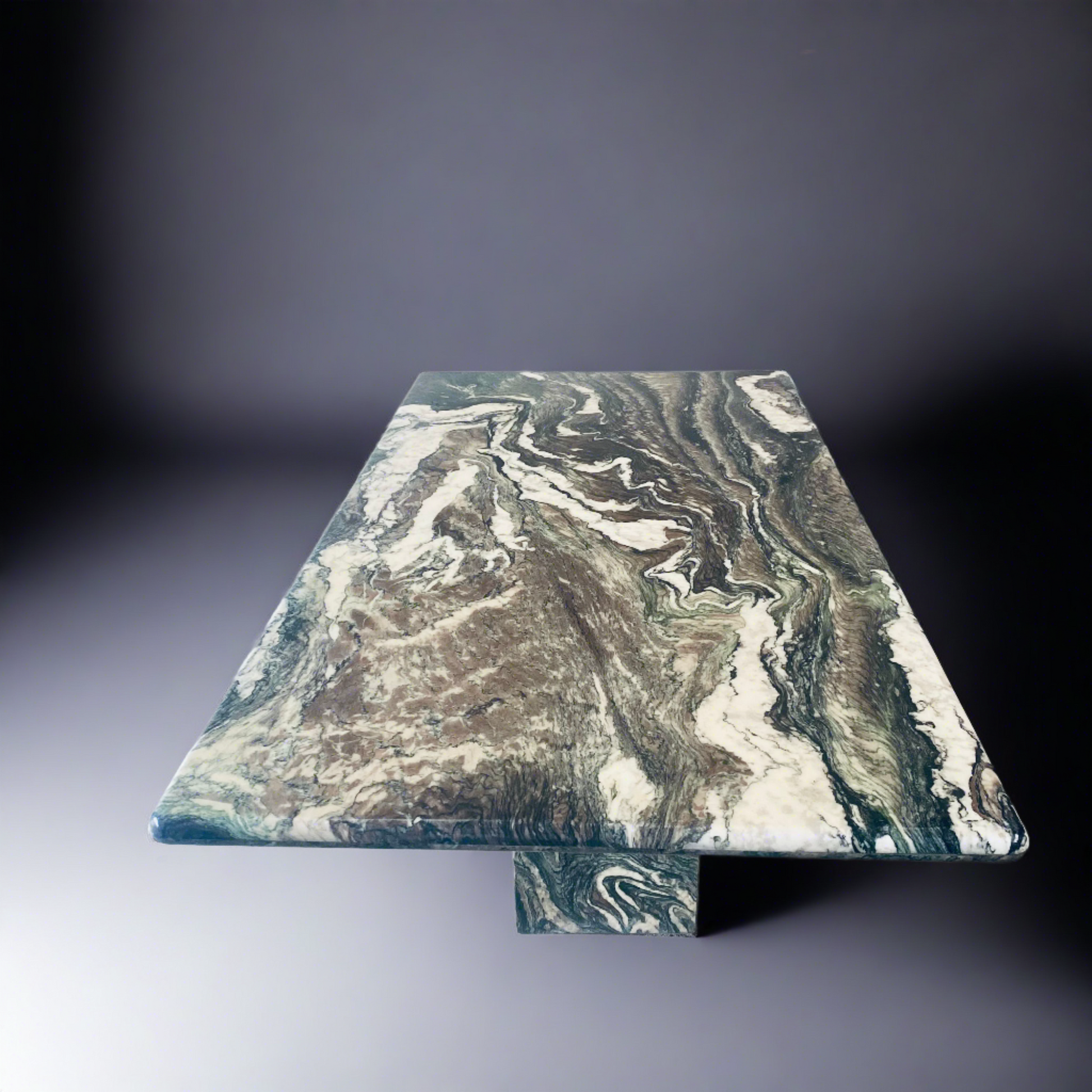 Der italienische Esstisch im postmodernen Stil ist ein wahres Kunstwerk. Seine Tischplatte aus Cipollino-Ondulato-Marmor besticht durch eine faszinierende Farbpalette. Die satten und einzigartigen Farbtöne des Marmors umfassen Schwarz, Grün, Taupe, Braun, Rosa, Rot und Beige. Diese harmonische Farbmischung verleiht Ihrem Essbereich nicht nur einen Hauch von Eleganz, sondern auch ein Gefühl von Opulenz.