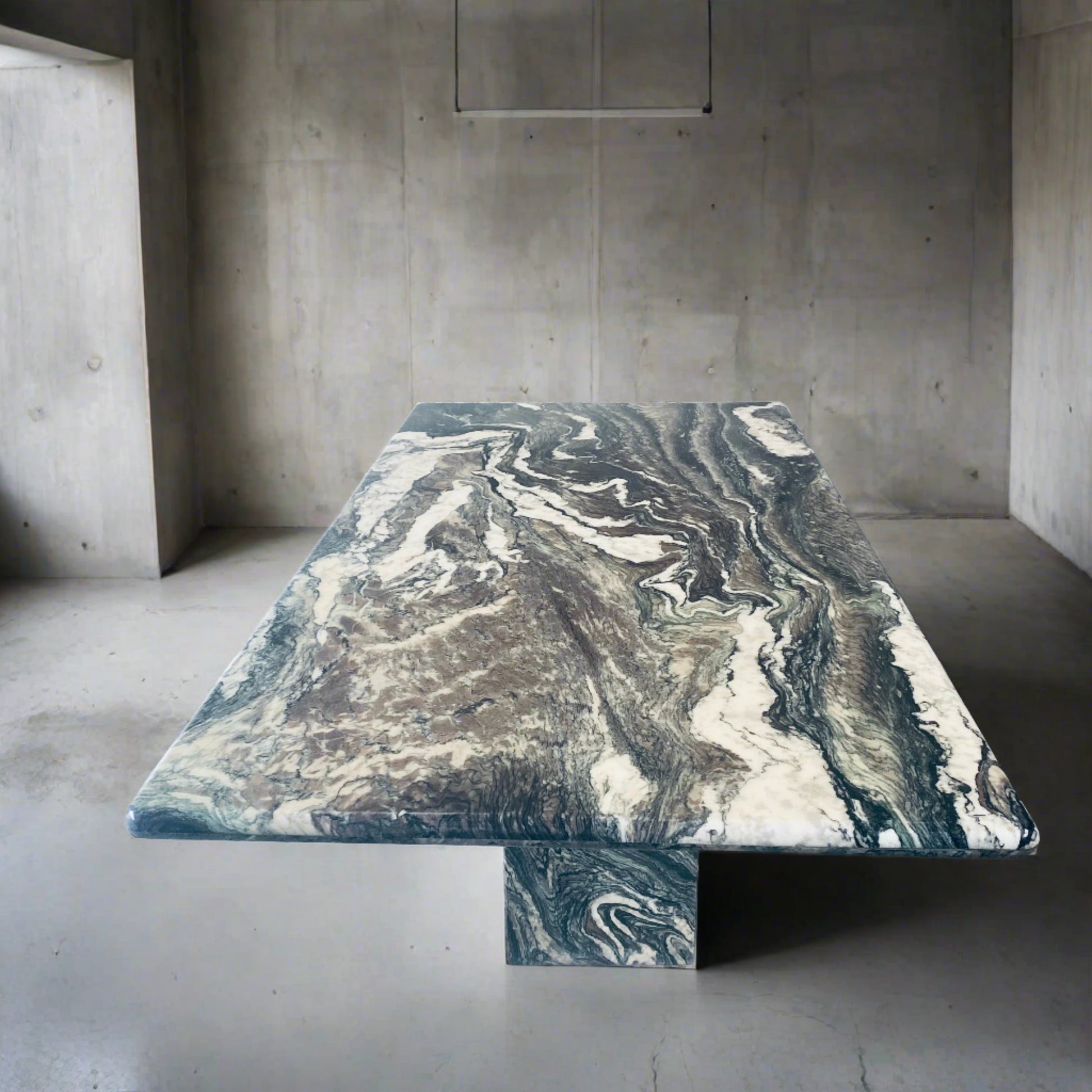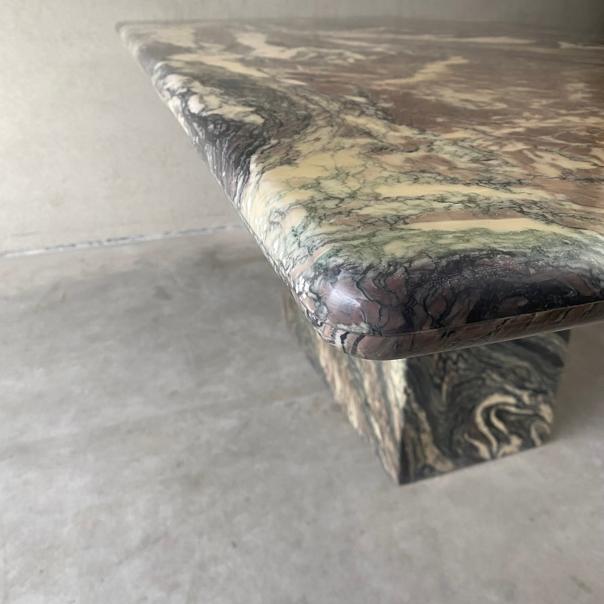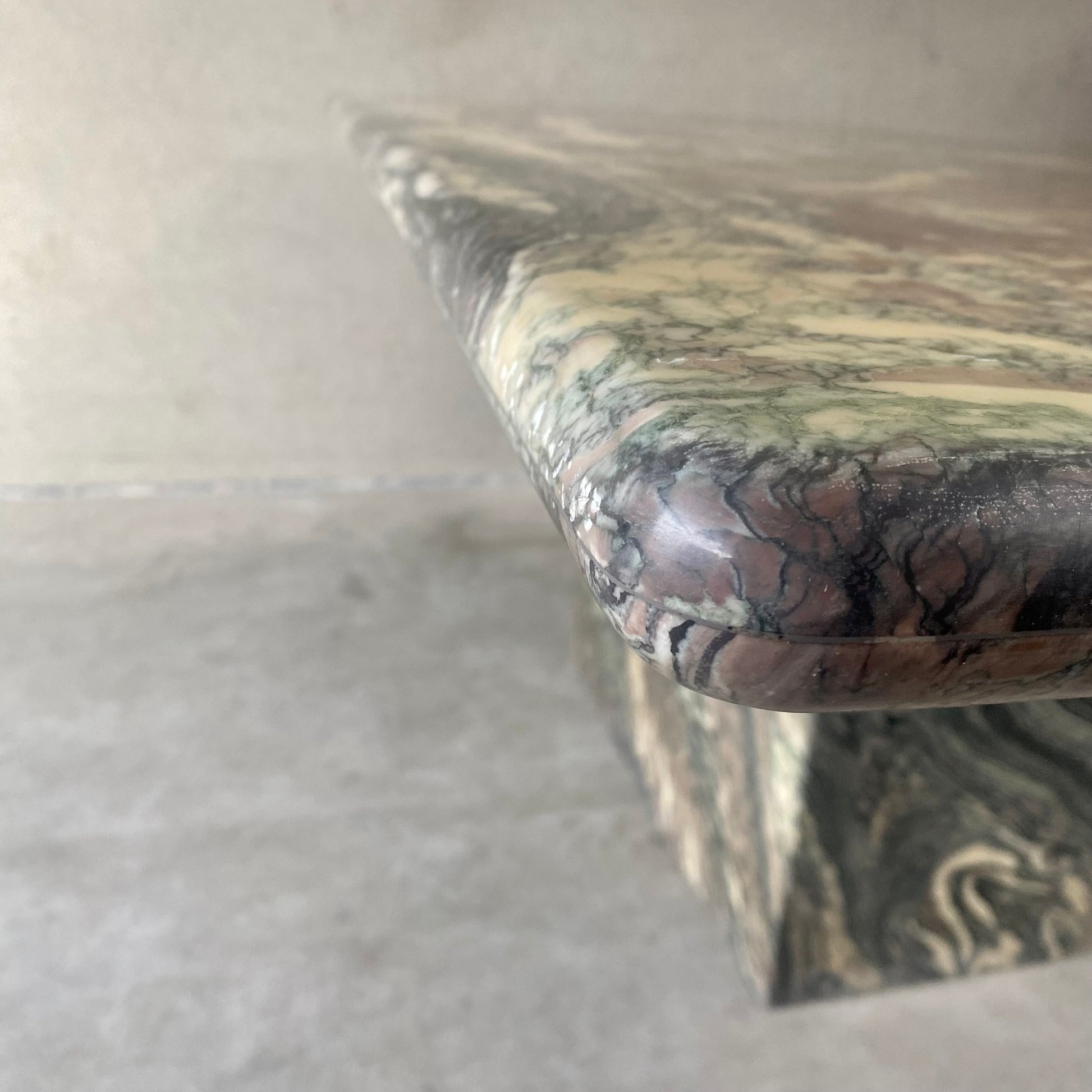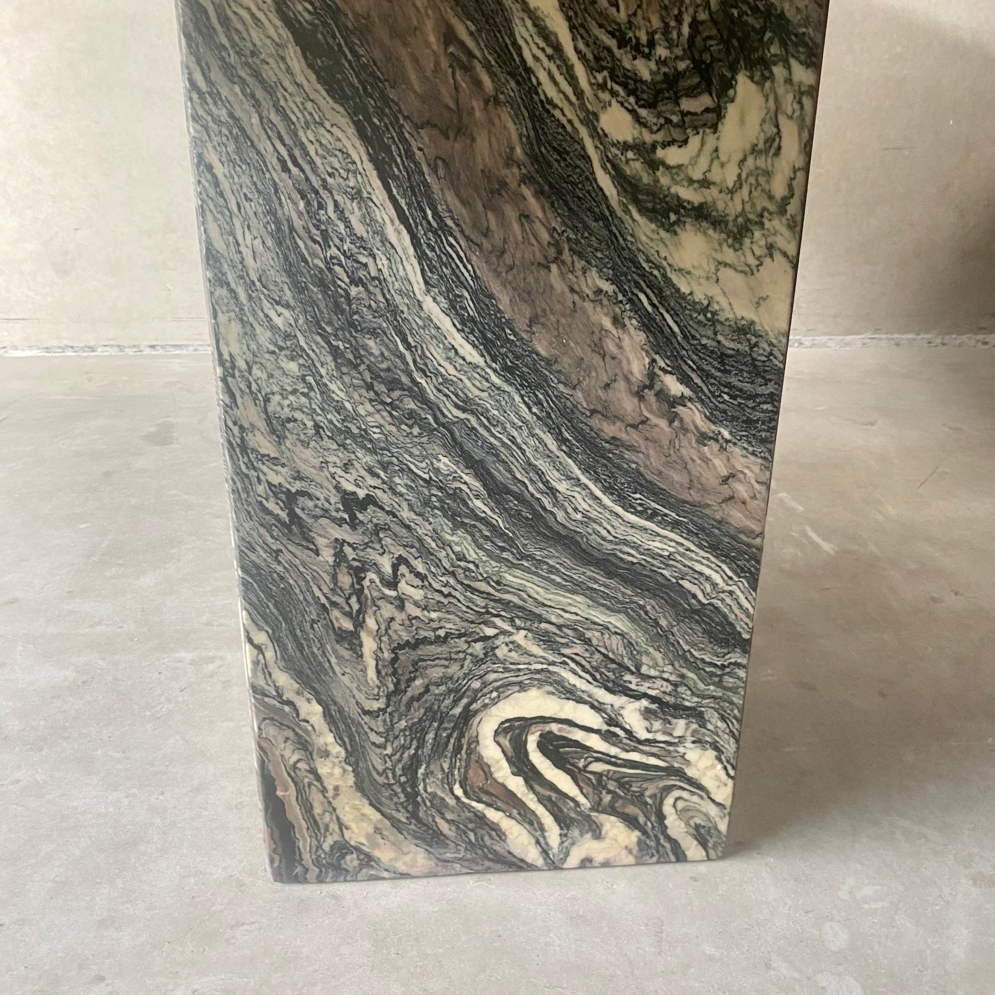 Der italienische Esstisch im postmodernen Stil ist ein wahres Kunstwerk. Seine Tischplatte aus Cipollino-Ondulato-Marmor besticht durch eine faszinierende Farbpalette. Die satten und einzigartigen Farbtöne des Marmors umfassen Schwarz, Grün, Taupe, Braun, Rosa, Rot und Beige. Diese harmonische Farbmischung verleiht Ihrem Essbereich nicht nur einen Hauch von Eleganz, sondern auch ein Gefühl von Opulenz.