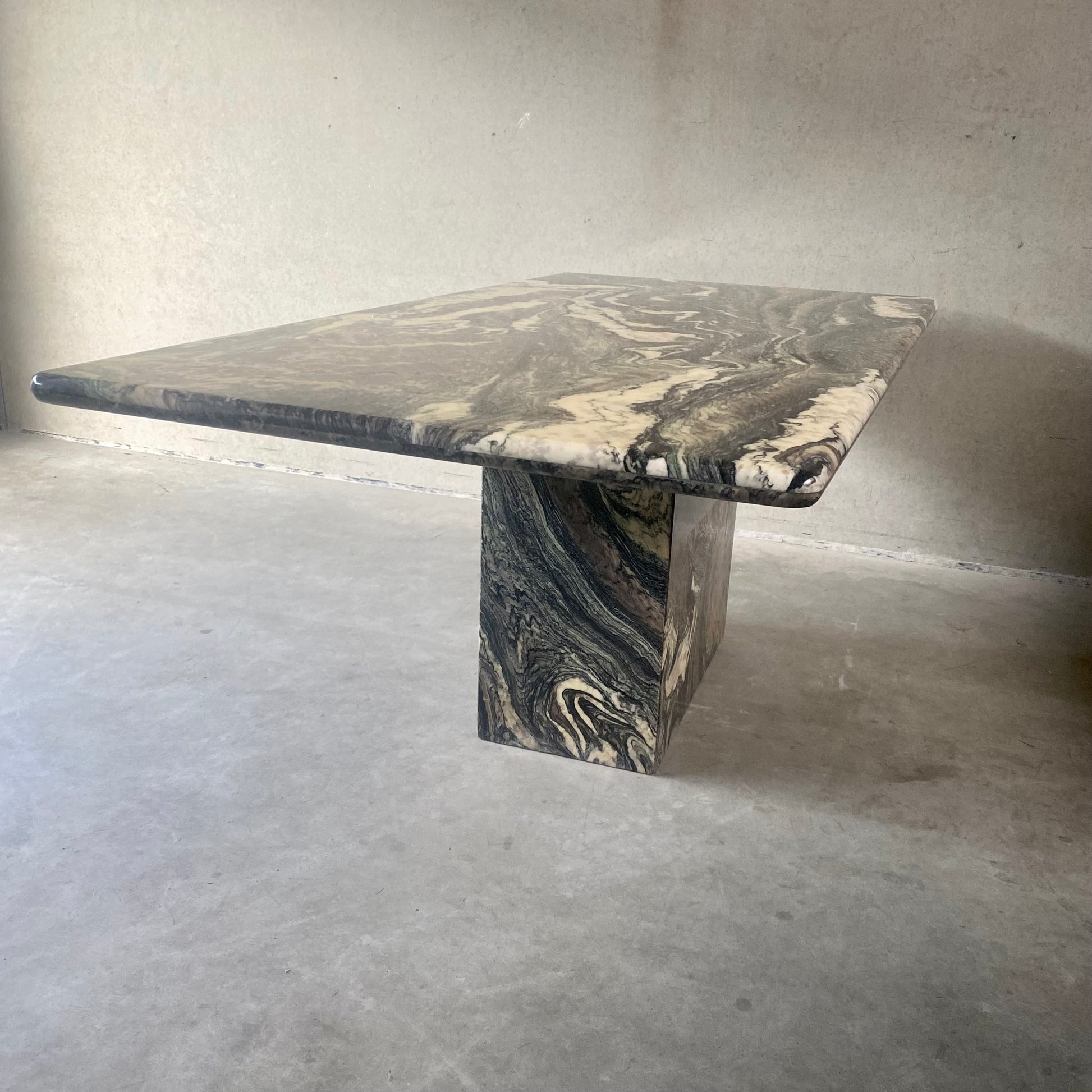 Suchen Sie ein außergewöhnliches Möbelstück für Ihr Esszimmer? Dann ist der italienische Esstisch im postmodernen Stil mit rechteckiger Tischplatte aus edlem Cipollino-Ondulato-Marmor genau das Richtige für Sie. Mit seinen Maßen von 190 cm x 99 cm x 75 cm ist dieses außergewöhnliche Stück die perfekte Ergänzung für Ihren Essbereich. Das Meisterwerk aus dem Jahr 1980 beweist die anhaltende Faszination des postmodernen Designs.