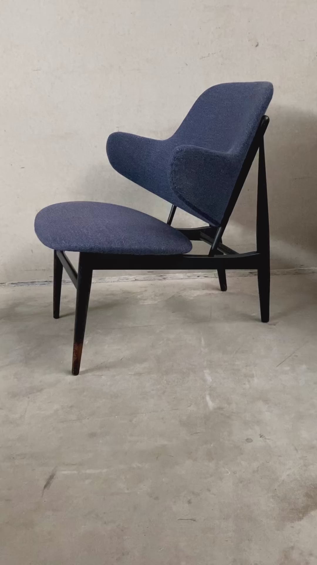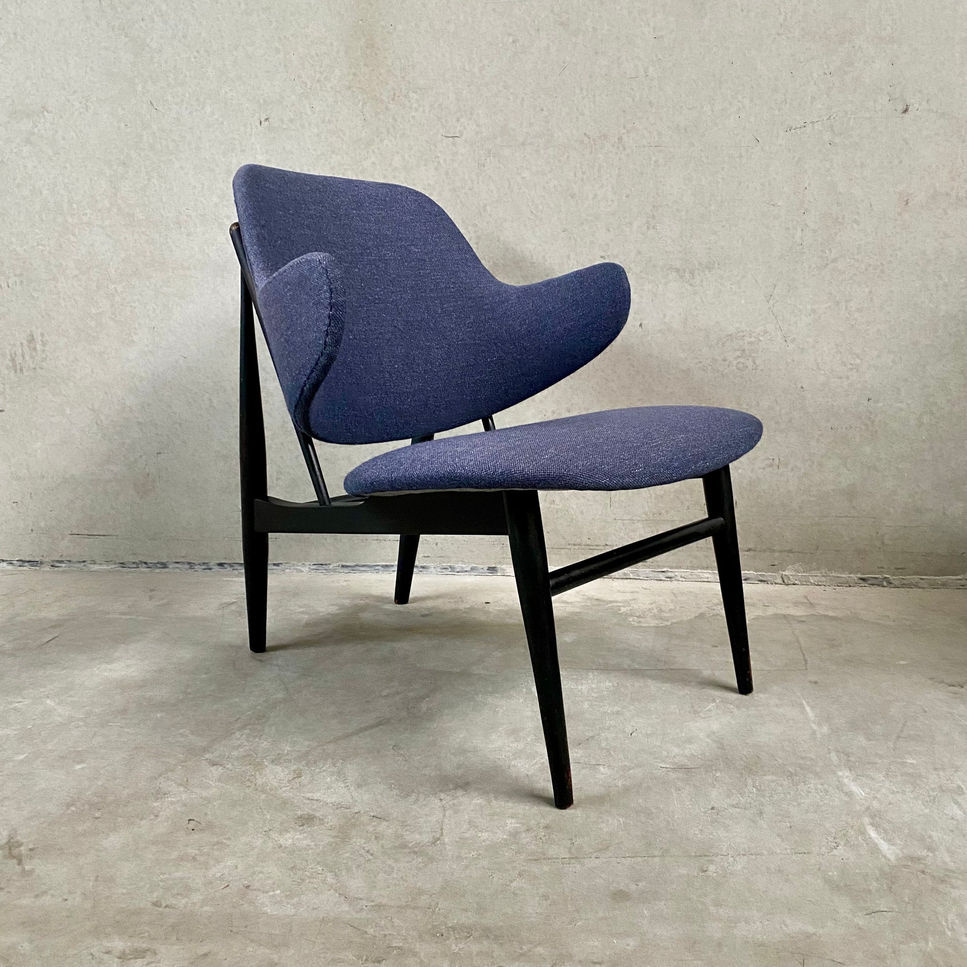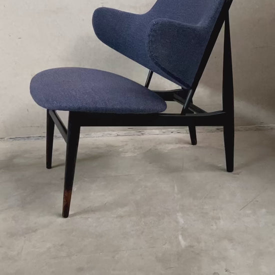 Élégance revisitée : En 1999, ce magnifique fauteuil vintage a bénéficié d’une transformation soignée grâce à l’ajout d’un tissu Kvadrat. Le revêtement, orné d’un captivant mélange de bleu et de violet, non seulement rajeunit le fauteuil, mais rehausse également son esthétique. L’alliance du design du milieu du siècle et du tissu contemporain illustre la parfaite intégration du passé et du présent.