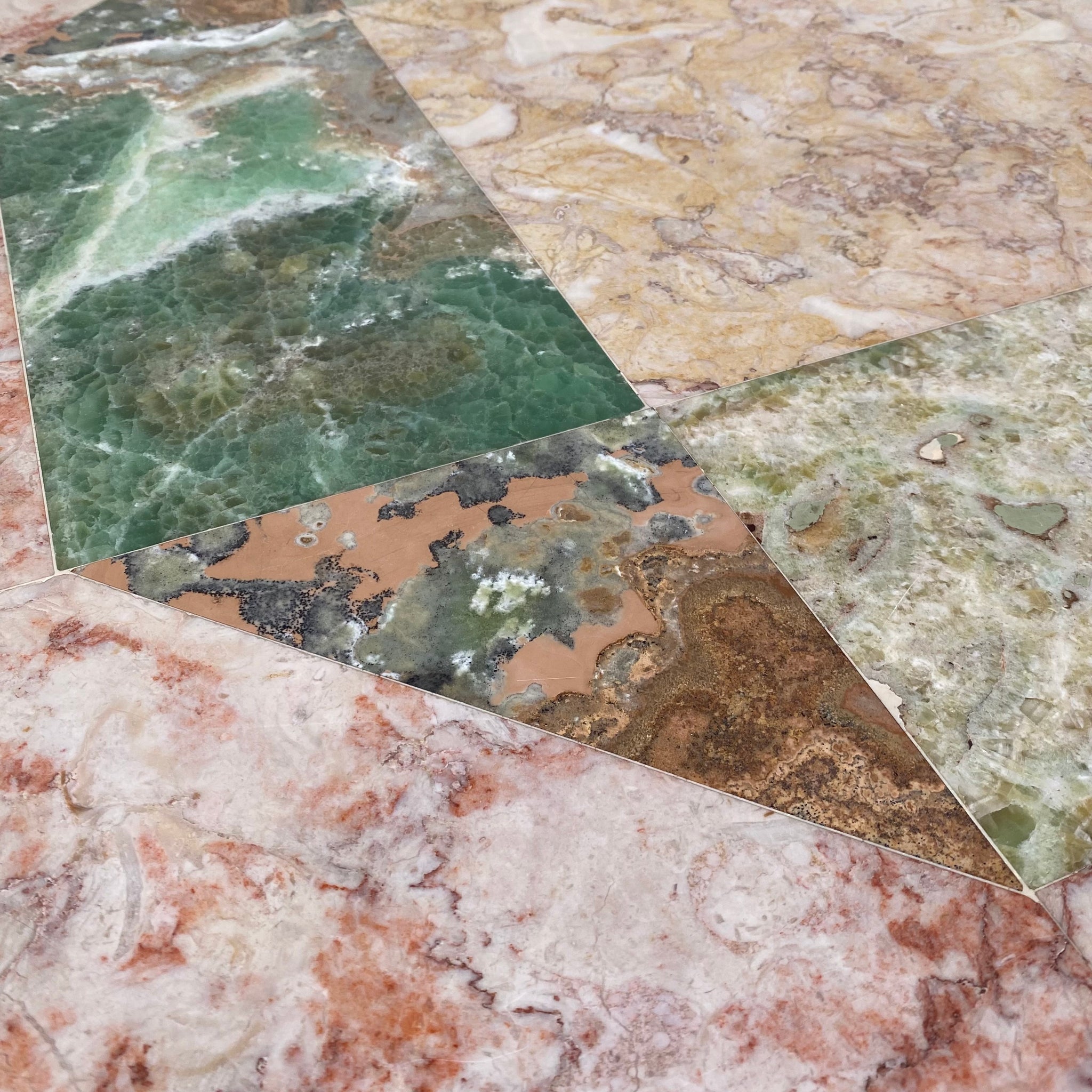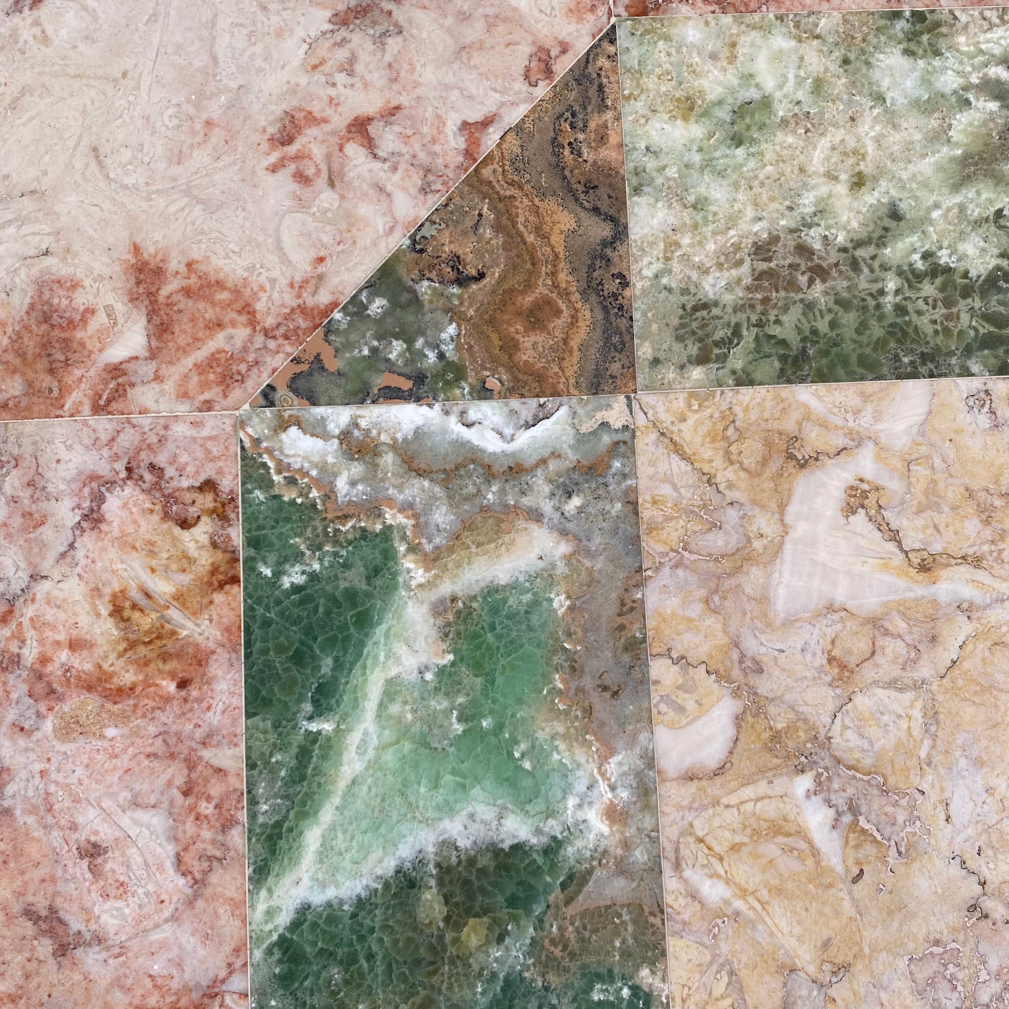 Exquisite marble inlay – A refined composition of soft pink, green, and beige marble, meticulously crafted into a harmonious geometric pattern.